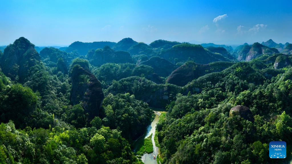 An aerial drone photo shows the scenery around Shangqing stream in Taining County, Sanming City, southeast China's Fujian Province, Aug. 11, 2024. Sanming City has been exploring a new path of development that embraces green transformation to boost rural tourism including forest-based health services and other economic activities. Currently, forests cover 77.12 percent of the total area in the city. (Xinhua/Jiang Kehong)