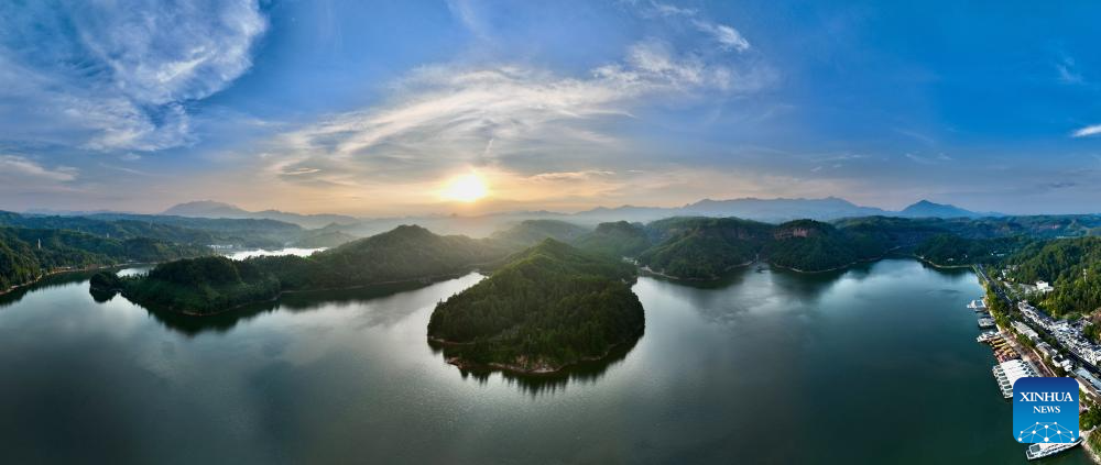 An aerial panoramic photo shows a view of Dajinhu scenic area of Taining County, Sanming City, southeast China's Fujian Province, Aug. 10, 2024. Sanming City has been exploring a new path of development that embraces green transformation to boost rural tourism including forest-based health services and other economic activities. Currently, forests cover 77.12 percent of the total area in the city. (Xinhua/Jiang Kehong)