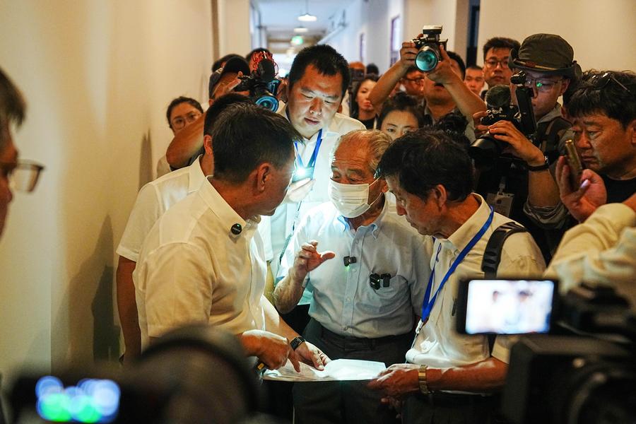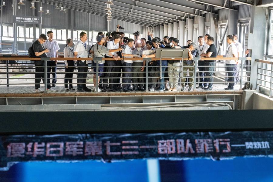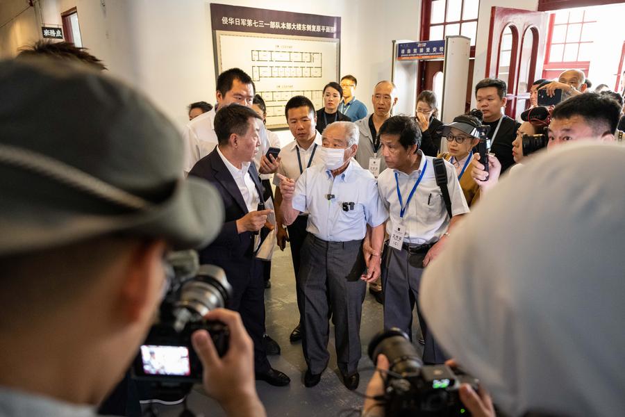 Hideo Shimizu (2nd R, front) identifies the crimes of the Japanese germ-warfare at the former site of Unit 731 in Harbin, northeast China's Heilongjiang Province, Aug. 13, 2024. (Xinhua/Xie Jianfei)