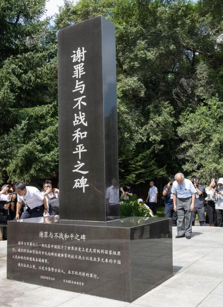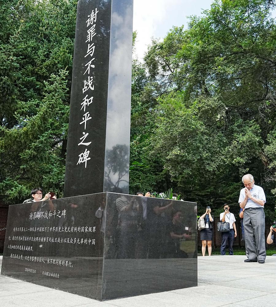 Hideo Shimizu offers an apology in front of an apology and anti-war monument at the former site of Unit 731 in Harbin, northeast China's Heilongjiang Province, Aug. 13, 2024. (Xinhua/Xie Jianfei)