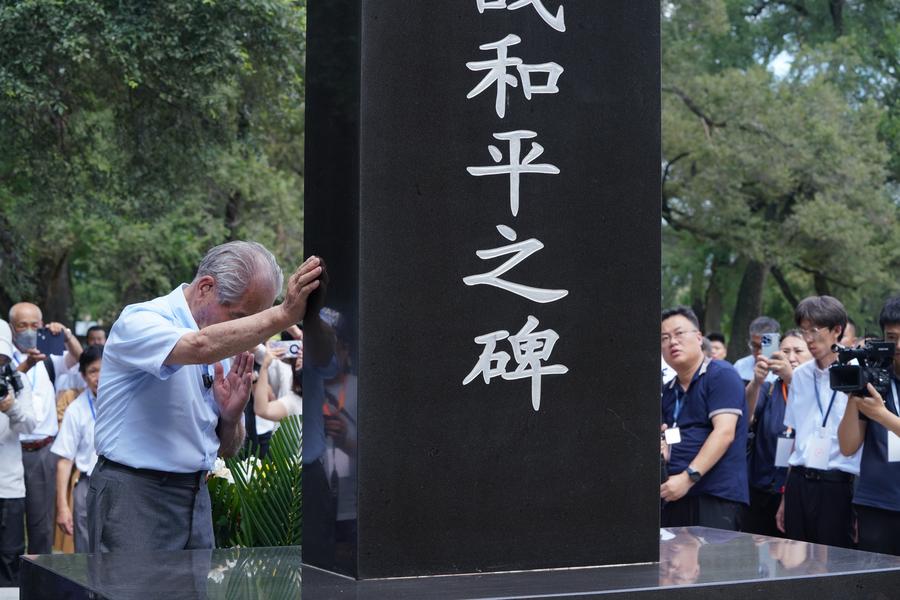 Hideo Shimizu offers an apology in front of an apology and anti-war monument at the former site of Unit 731 in Harbin, northeast China's Heilongjiang Province, Aug. 13, 2024. (Xinhua/Wang Jianwei)