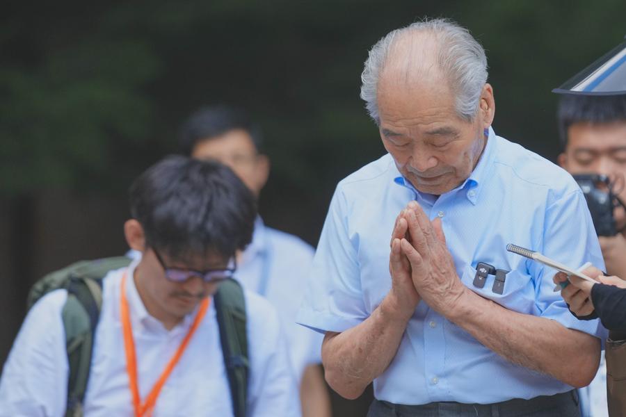 Hideo Shimizu (2nd L, front) puts his palms together as he identifies the crimes of the Japanese germ-warfare at the former site of Unit 731 in Harbin, northeast China's Heilongjiang Province, Aug. 13, 2024. (Xinhua/Xie Jianfei)