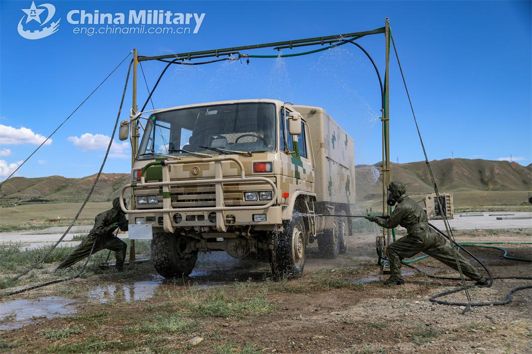Soldiers assigned to a regiment of the PLA Xinjiang Military Command conduct decontamination to a vehicle during a chemical defense emergency training exercise on July 10, 2024. (eng.chinamil.com.cn/Photo by Mei Junqi)