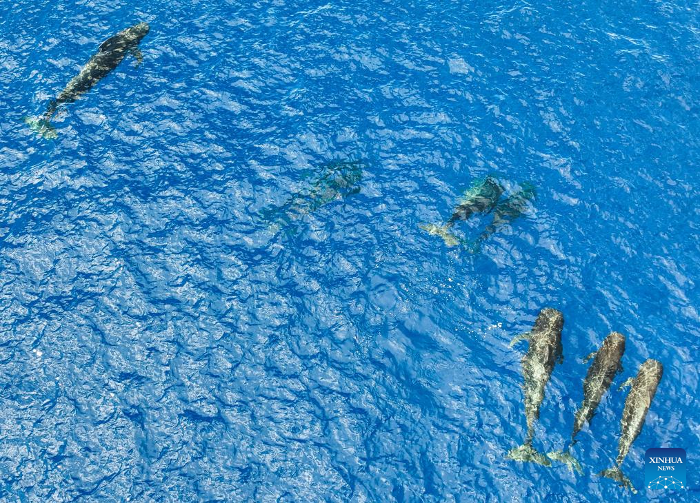 An aerial drone photo taken on June 30, 2024 shows short-finned pilot whales swimming in the South China Sea.