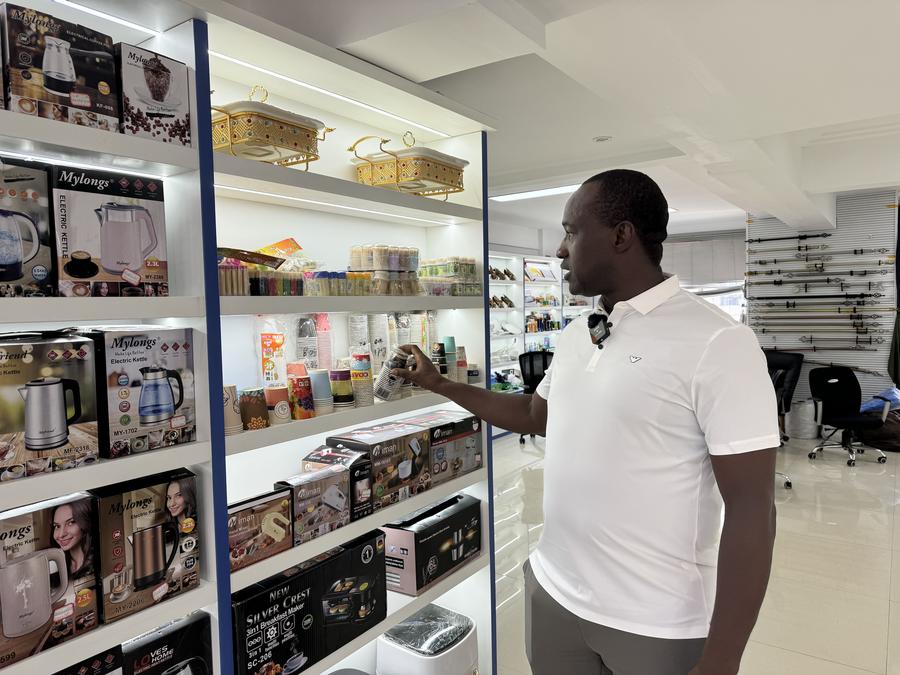Tirera Sourakhata, a merchant from Senegal, introduces his products in Yiwu City, east China's Zhejiang Province, Aug. 12, 2024. (Xinhua/Shang Yiying)