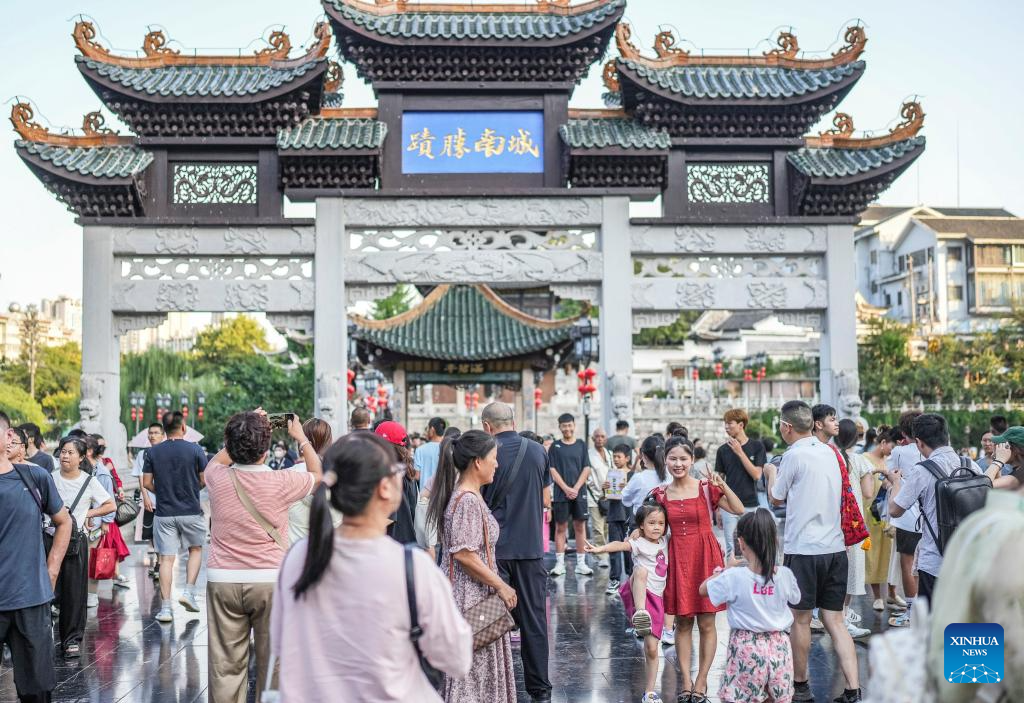 Tourists visit an ancient town in Zhongshan District of Liupanshui, southwest China's Guizhou Province, Aug. 8, 2024. Guizhou Province, with its cool climate and rich tourism resources, attracts tourists from all over the country during the peak summer travel season. (Xinhua/Tao Liang)