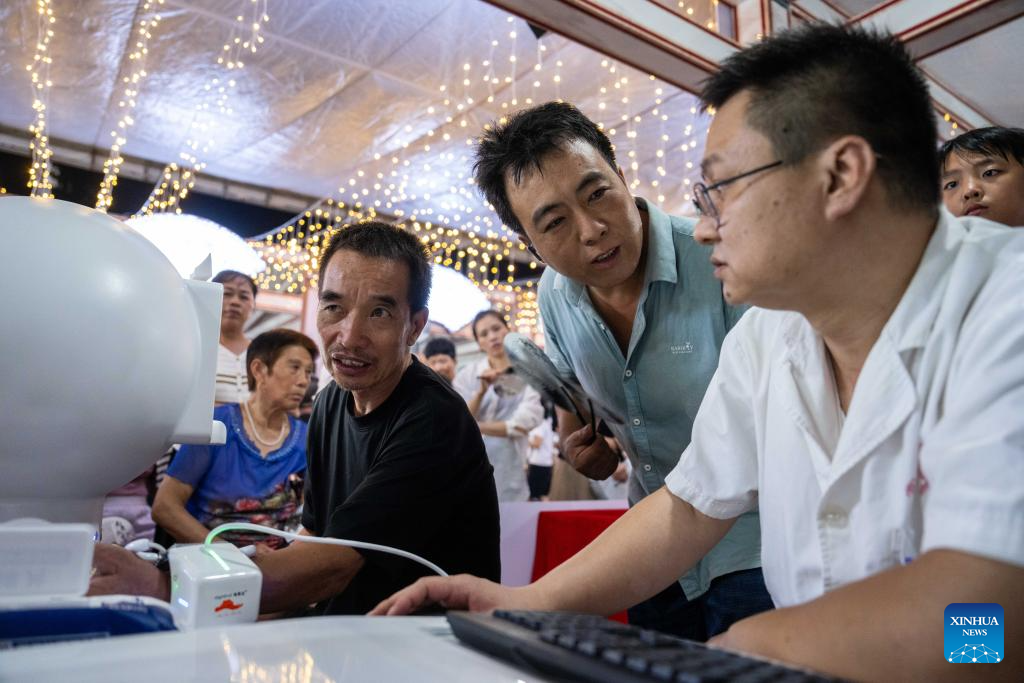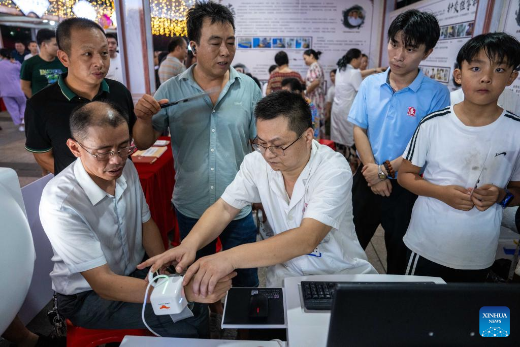 A medical worker (3rd R) takes a citizen's pulse with electric device at a night traditional Chinese medicine clinic in Changning City, central China's Hunan Province, Aug. 13, 2024. (Xinhua/Chen Sihan)