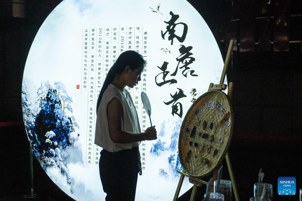 A citizen learns about traditional Chinese medicine herbs at a night traditional Chinese medicine clinic in Changning City, central China's Hunan Province, Aug. 13, 2024.?(Xinhua/Chen Sihan)