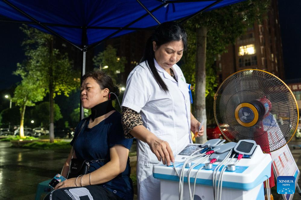 A citizen receives physical therapy at a night traditional Chinese medicine clinic in Changning City, central China's Hunan Province, Aug. 13, 2024.?(Xinhua/Chen Sihan)