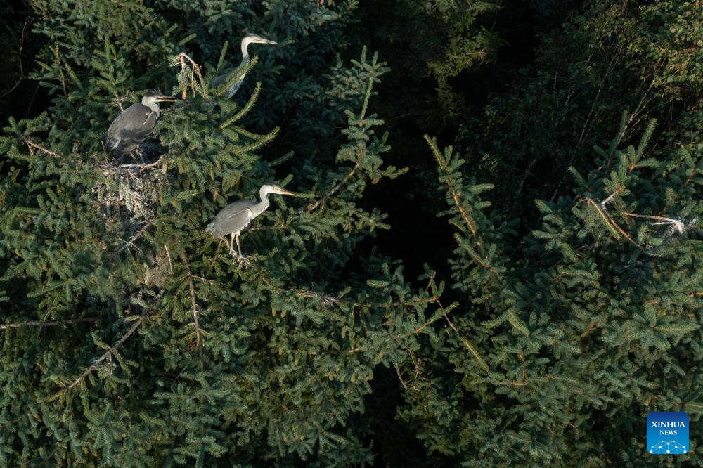 An aerial drone photo taken on July 24, 2024 shows herons in a forest in Heihe City, northeast China's Heilongjiang Province. As the eastern part of the Three-North Shelterbelt Forest Program (TSFP), a large-scale afforestation project, northeast China has seen continuous improvement of ecological environment. China proposed in June 2023 to turn the TSFP into a fully functional and unbreakable "green Great Wall" and ecological security barrier in northern China. Launched in 1978, the TSFP aims to rehabilitate and green desert-prone lands and desertified areas in northwest, north and northeast China. (Xinhua/Xie Jianfei)