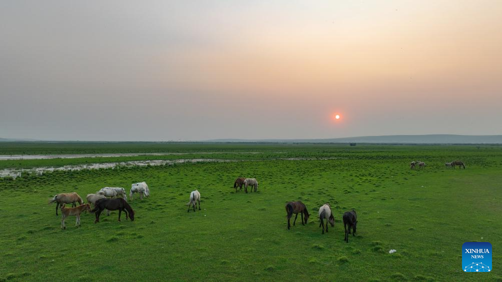 An aerial drone photo taken on July 18, 2024 shows sunset scenery at the Wulanmaodu pasture, north China's Inner Mongolia Autonomous Region. As the eastern part of the Three-North Shelterbelt Forest Program (TSFP), a large-scale afforestation project, northeast China has seen continuous improvement of ecological environment. China proposed in June 2023 to turn the TSFP into a fully functional and unbreakable "green Great Wall" and ecological security barrier in northern China. Launched in 1978, the TSFP aims to rehabilitate and green desert-prone lands and desertified areas in northwest, north and northeast China. (Xinhua/Bei He)