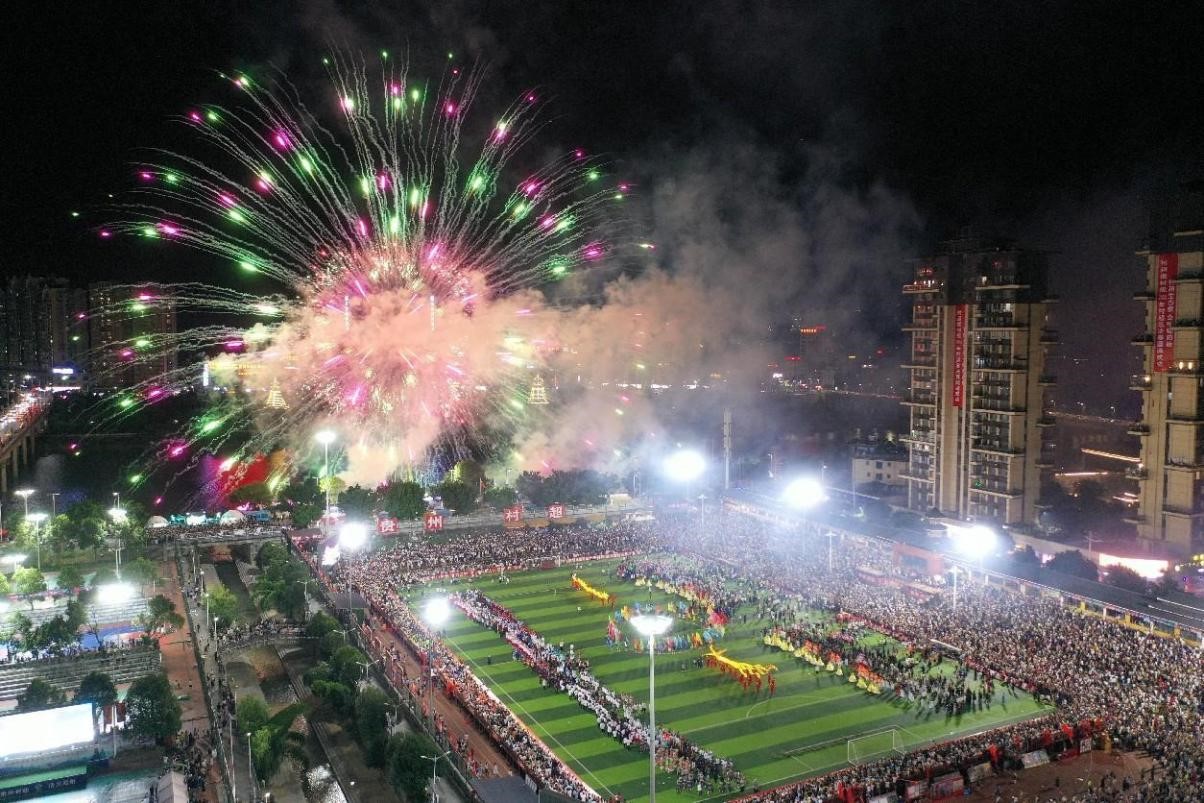 A firework show is staged during the final competition of the Village Super League (VSL) in Rongjiang county, southwest China's Guizhou province, July 20, 2024. (People's Daily Online/Yang Wenshu)