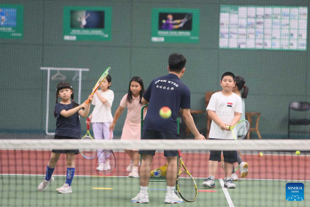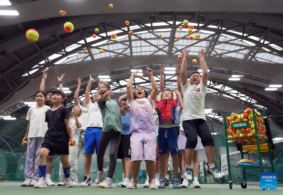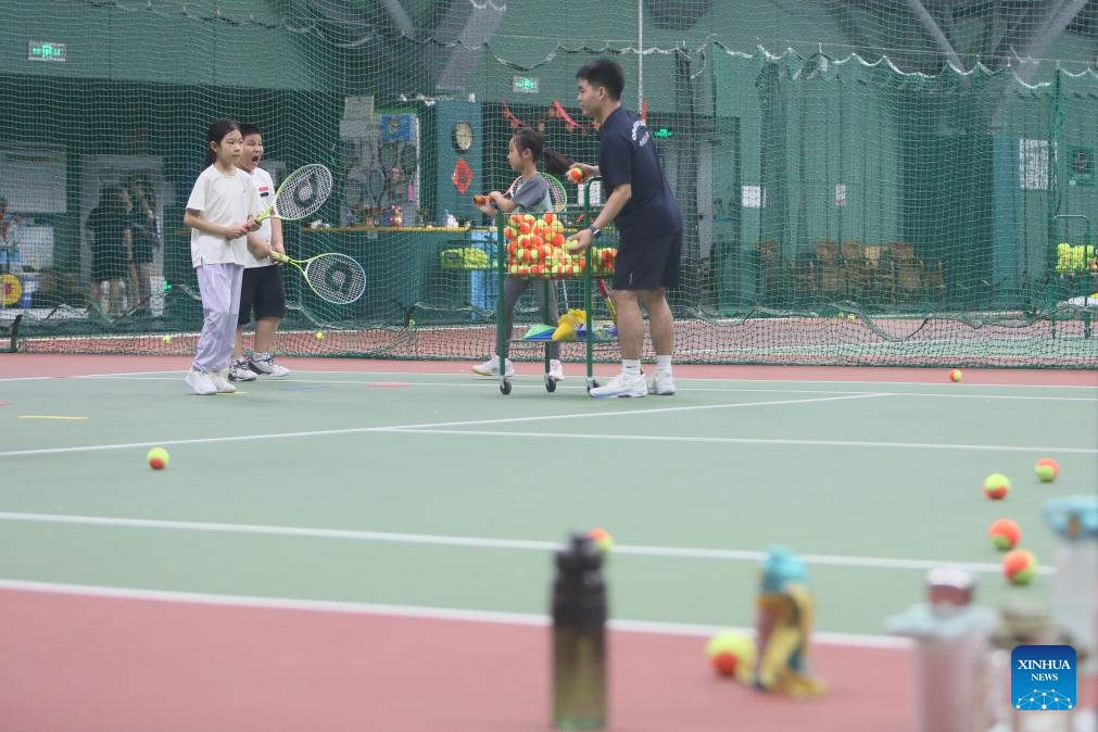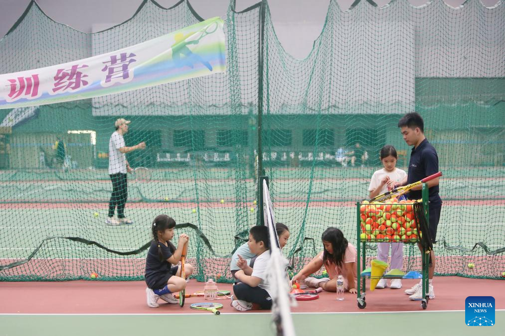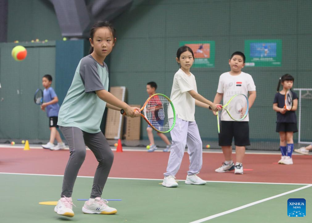 Children students participate in a tennis summer camp at a tennis club in Beijing, China, Aug. 14, 2024. (Xinhua/Cai Yang)