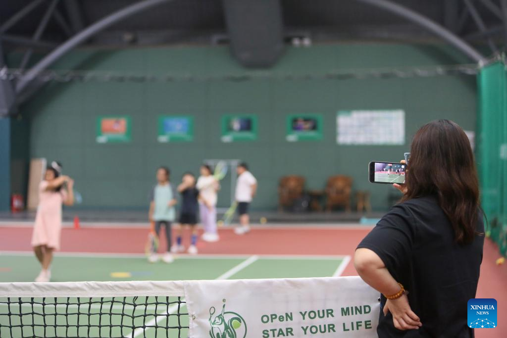A parent takes videos of children students participating in a tennis summer camp at a tennis club in Beijing, China, Aug. 14, 2024. (Xinhua/Cheng Li)