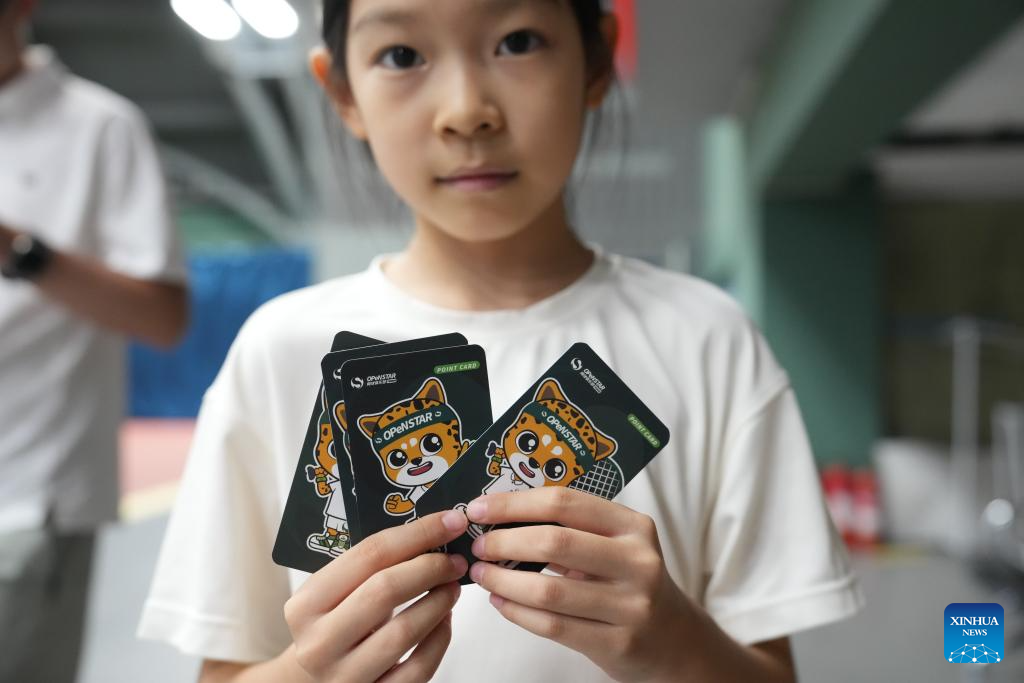 A child displays reward cards after participating in a tennis summer camp at a tennis club in Beijing, China, Aug. 14, 2024. (Xinhua/Cai Yang)