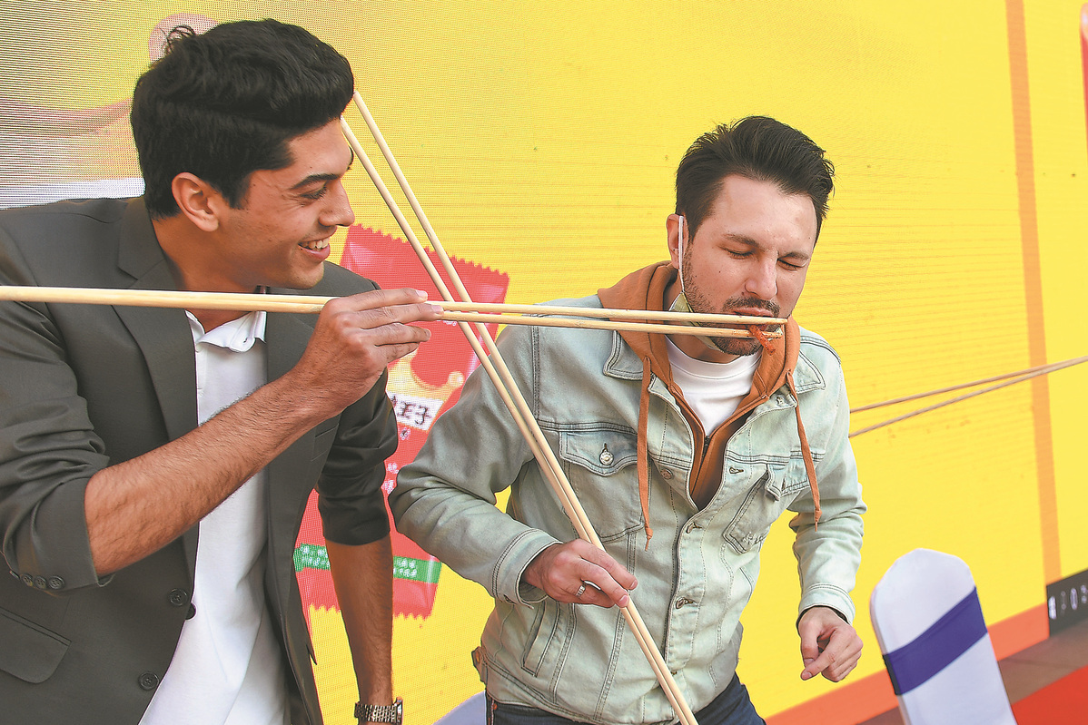 Participants compete in a latiao eating competition in Changsha, Hunan province, on Nov 13, 2021. (YANG HUAFENG/CHINA NEWS SERVICE)