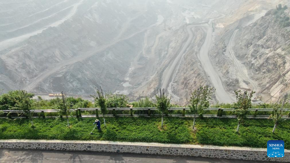 A worker mows the lawn at the Nanfen iron open-pit mine in Benxi, northeast China's Liaoning Province, Aug. 15, 2024. The Nanfen iron open-pit mine in northeast China's Liaoning Province in recent years has been making efforts to promote green and sustainable development. (Xinhua/Pan Yulong)