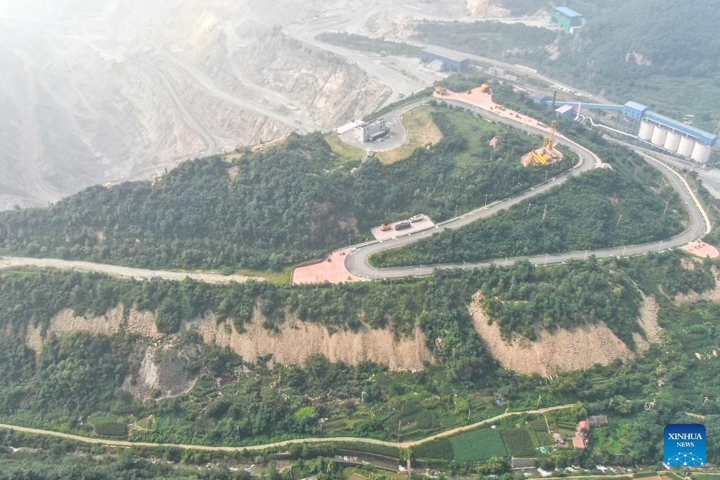 This aerial drone photo taken on Aug. 15, 2024 shows a worker mowing the lawn at the Nanfen iron open-pit mine in Benxi, northeast China's Liaoning Province. The Nanfen iron open-pit mine in northeast China's Liaoning Province in recent years has been making efforts to promote green and sustainable development. (Xinhua/Pan Yulong)