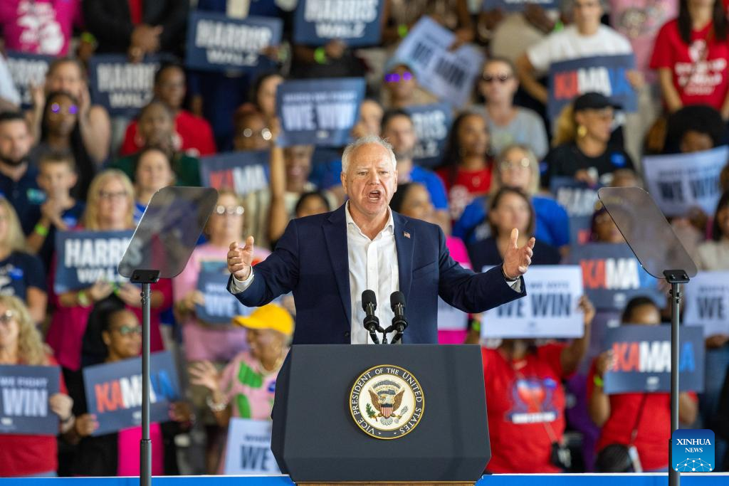 File photo taken on Aug. 7, 2024 shows Tim Walz speaking during a campaign rally at an airport hangar outside Detroit, Michigan, the United States. U.S. Vice Presidential nominees - Minnesota Governor Tim Walz and Ohio Senator J.D. Vance - on Thursday agreed to participate in a debate hosted by CBS News, which is scheduled for Oct. 1. (Xinhua/Hu Yousong)