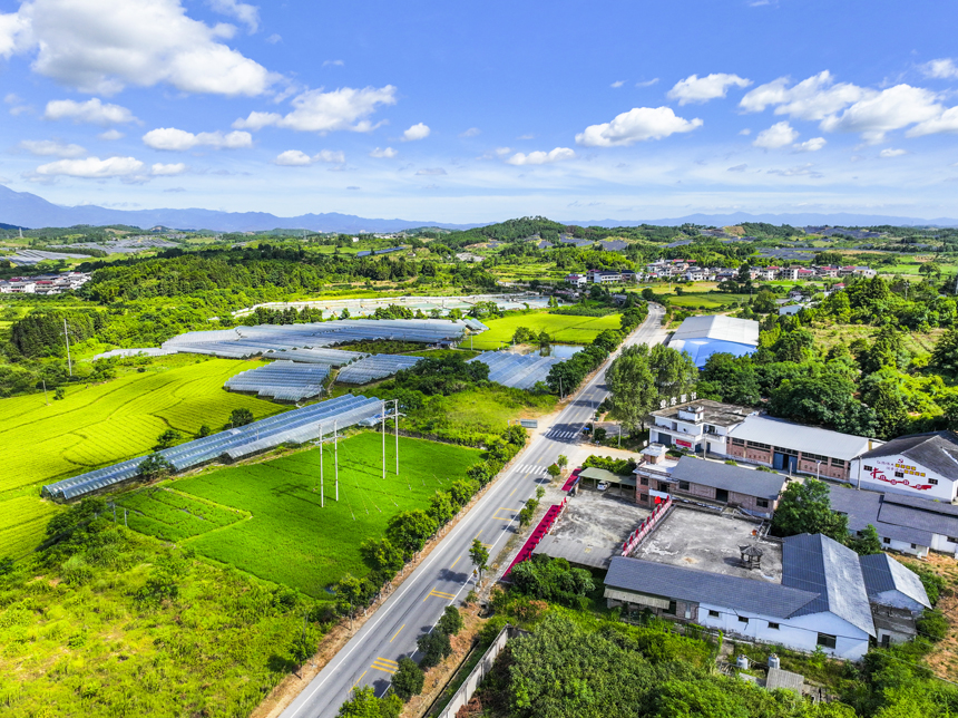 On Aug. 9, greenhouses and dwellings stand in harmony with fields and roads, presenting a picturesque scene of industrial prosperity and rural beauty in Gucheng village of Sangtian town, Nanfeng county, Fuzhou city, east China's Jiangxi Province.