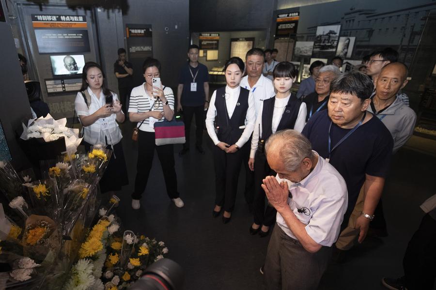 Hideo Shimizu prays in front of the list of victims at the Exhibition Hall of Evidences of Crime Committed by Unit 731 of the Japanese Imperial Army in Harbin, northeast China's Heilongjiang Province, Aug. 13, 2024. (Xinhua/Zhang Tao)