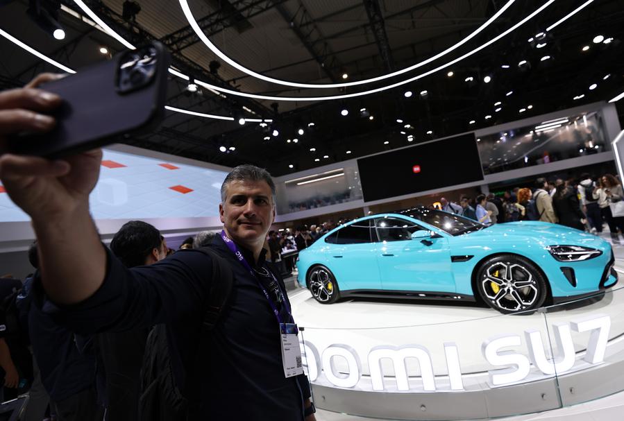 A person takes selfies with Xiaomi's SU7 car during the Mobile World Congress in Barcelona, Spain, Feb. 26, 2024. (Xinhua/Gao Jing)
