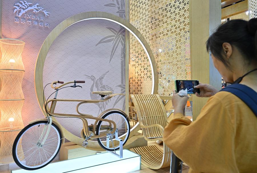A visitor takes photos of a bicycle made of bamboo at the environmental services exhibition of the 2023 China International Fair for Trade in Services in Beijing, capital of China, Sept. 2, 2023. (Xinhua/Li Xin)