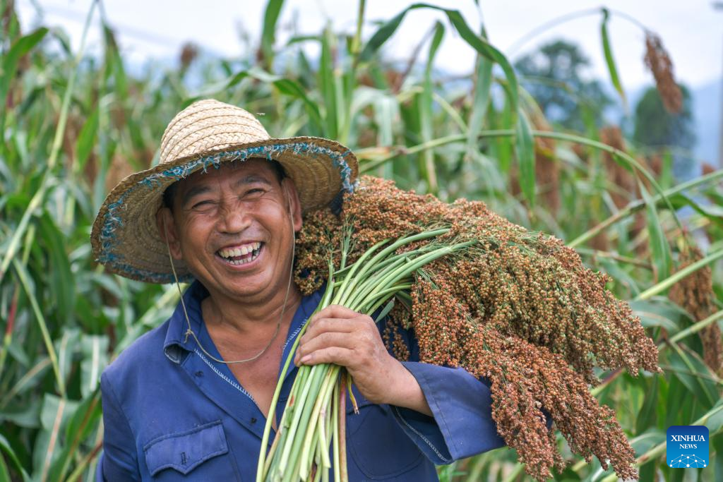 A farmer shows newly harvested sorghum at Yantou Village of Changgang Town, Huairen City of southwest China's Guizhou Province, Aug. 16, 2024. Covering an area of 24,000 hectares, the sorghum fields in Huairen has successively entered its harvest season recently. (Xinhua/Yang Wenbin)