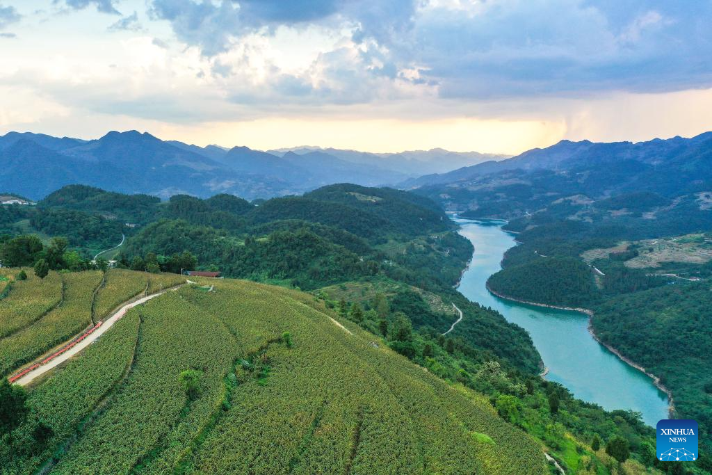A drone photo shows a sorghum field at Maopo Village of Changgang Town, Huairen City of southwest China's Guizhou Province, Aug. 15, 2024. Covering an area of 24,000 hectares, the sorghum fields in Huairen has successively entered its harvest season recently. (Xinhua/Yang Wenbin)
