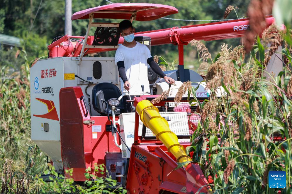 A man drives a harvester to reap sorghum at Bojiba Village of Daba Town, Huairen City of southwest China's Guizhou Province, Aug. 15, 2024. Covering an area of 24,000 hectares, the sorghum fields in Huairen has successively entered its harvest season recently. (Xinhua/Yang Wenbin)