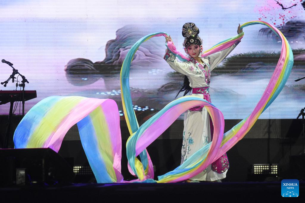 An actress from east China's Zhejiang Wu Opera Research Center performs during the Na Praia Festival-China Day in Brazilia, Brazil on Aug. 17, 2024. This event was held here on Saturday in commemoration of the 50th anniversary of the establishment of diplomatic relations between China and Brazil. (Photo by Lucio Tavora/Xinhua)