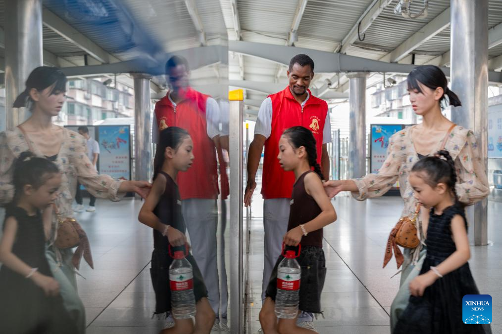 Lugazo Abubakar Lugazo (L) provides help for a passenger at a metro station in Wuhan, central China's Hubei Province, Aug. 18, 2024. (Xinhua/Wu Zhizun)