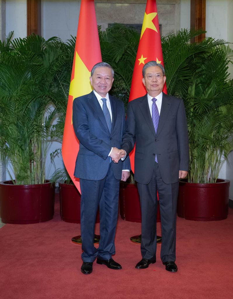 Zhao Leji, chairman of the National People's Congress Standing Committee, meets with To Lam, general secretary of the Communist Party of Vietnam Central Committee and Vietnamese president, in Beijing, capital of China, Aug. 19, 2024. (Xinhua/Zhai Jianlan)