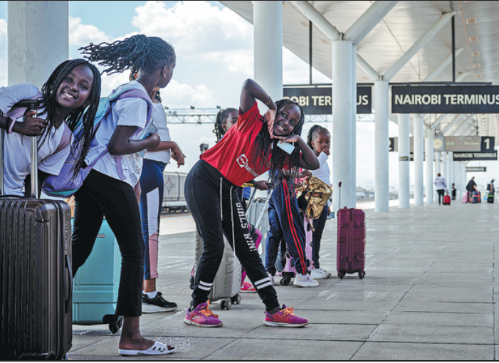 Children wait to board a train of the Mombasa-Nairobi Standard Gauge Railway in Nairobi, Kenya, in October. (WANG GUANSEN/XINHUA)