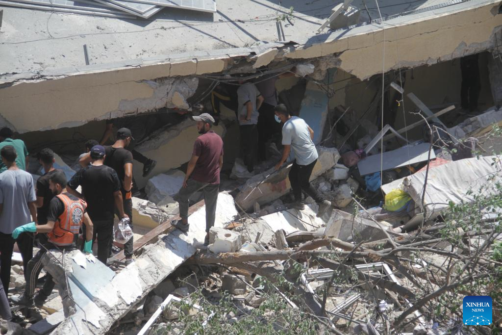 People search for victims among the rubble of a school building destroyed in an Israeli airstrike at the al-Rimal neighborhood in Gaza City, on Aug. 20, 2024. At least nine Palestinians were killed, and others were wounded in an Israeli airstrike on a school sheltering displaced people in Gaza City, Palestinian security and medical sources said Tuesday. (Photo by Mahmoud Zaki/Xinhua)