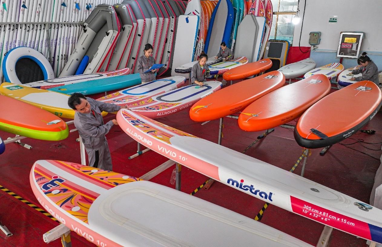 Surfboards to be exported are manufactured in a workshop of an outdoor sports equipment company in Rongcheng, east China's Shandong province. (People's Daily Online/Li Xinjun)