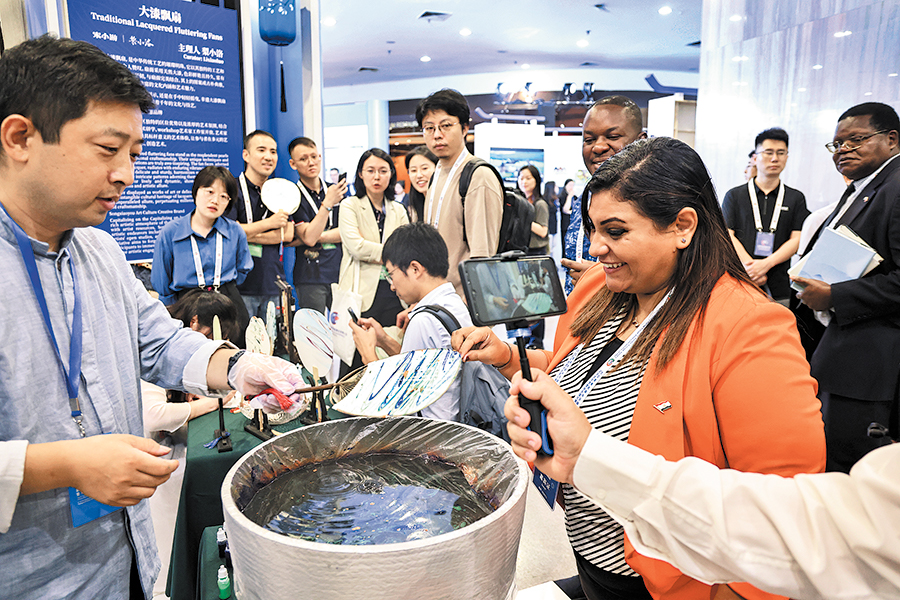A participant at the 6th Forum on China-Africa Media Cooperation & China-Africa Think Tank High-Level Dialogue learns about the production process of traditional lacquered fluttering fans, which are made using a technique based on a national intangible heritage, in Beijing on Wednesday. (WANG JING/CHINA DAILY)
