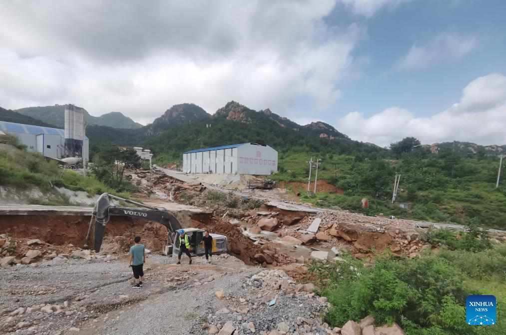 Workers try to restore the road damaged by heavy rains in Huludao City, northeast China's Liaoning Province, Aug. 21, 2024. The ongoing heavy rains have lashed the city of Huludao in Liaoning Province in recent days, causing severe damages to many townships. A joint emergency rescue team bearing relief materials has been dispatched by authorities to carry out rescue and relief work. (Xinhua)