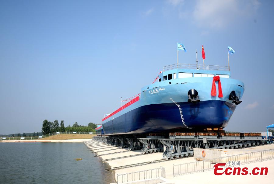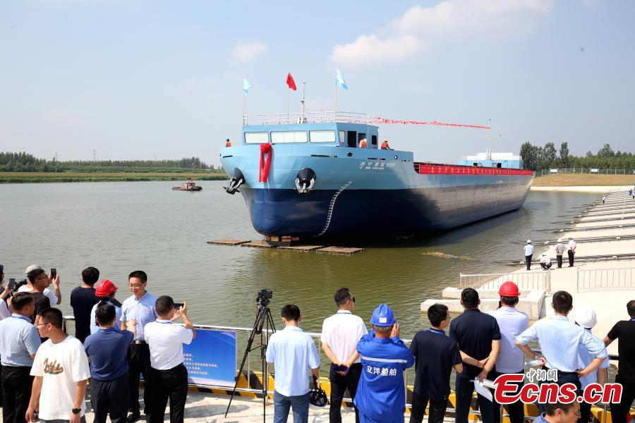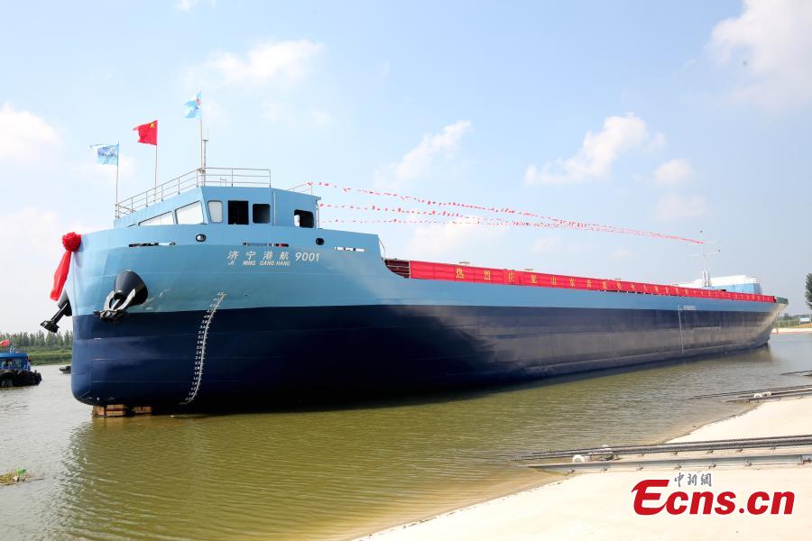 A new energy smart cargo ship, which will run along the Beijing-Hangzhou Grand Canal, is launched in Zoucheng, east China's Shandong Province, Aug. 22, 2024. (Photo: China News Service/Lv Weifeng)