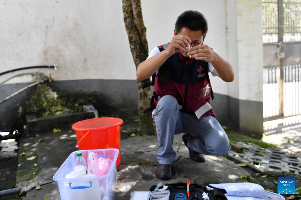 A staff member tests the water quality at a middle school in Zixing City, central China's Hunan Province, Aug. 23, 2024. Local authorities are speeding up the reconstruction of the campus for the new semester after rainstorms unleashed by Typhoon Gaemi hit the city and damaged buildings and facilities in over 40 schools. (Xinhua/Chen Zhenhai)