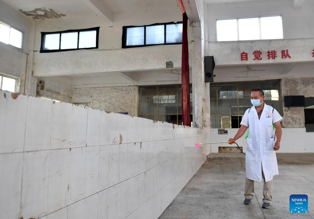 A medical worker carries out disinfection at a middle school in Zixing City, central China's Hunan Province, Aug. 22, 2024. Local authorities are speeding up the reconstruction of the campus for the new semester after rainstorms unleashed by Typhoon Gaemi hit the city and damaged buildings and facilities in over 40 schools. (Xinhua/Chen Zhenhai)