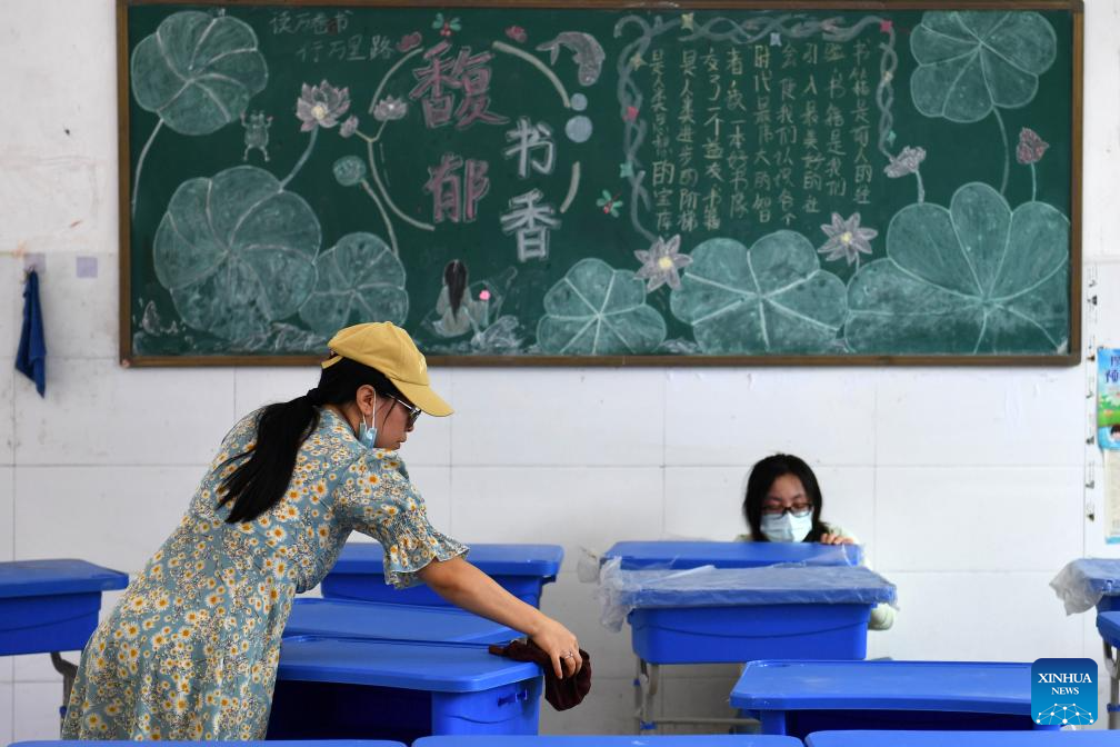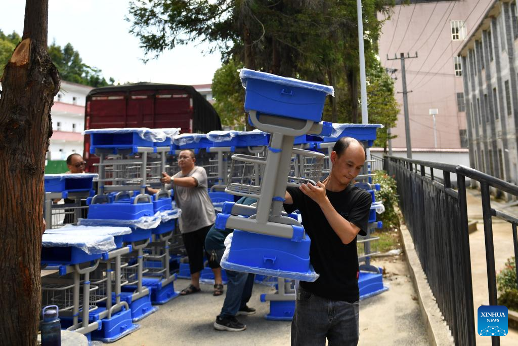 Staff members arrange new desks at a middle school in Zixing City, central China's Hunan Province, Aug. 23, 2024. Local authorities are speeding up the reconstruction of the campus for the new semester after rainstorms unleashed by Typhoon Gaemi hit the city and damaged buildings and facilities in over 40 schools. (Xinhua/Chen Zhenhai)