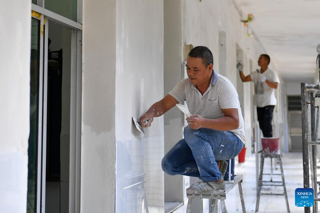 Workers rebuild a playground at a middle school in Zixing City, central China's Hunan Province, Aug. 22, 2024. Local authorities are speeding up the reconstruction of the campus for the new semester after rainstorms unleashed by Typhoon Gaemi hit the city and damaged buildings and facilities in over 40 schools. (Xinhua/Chen Zhenhai)