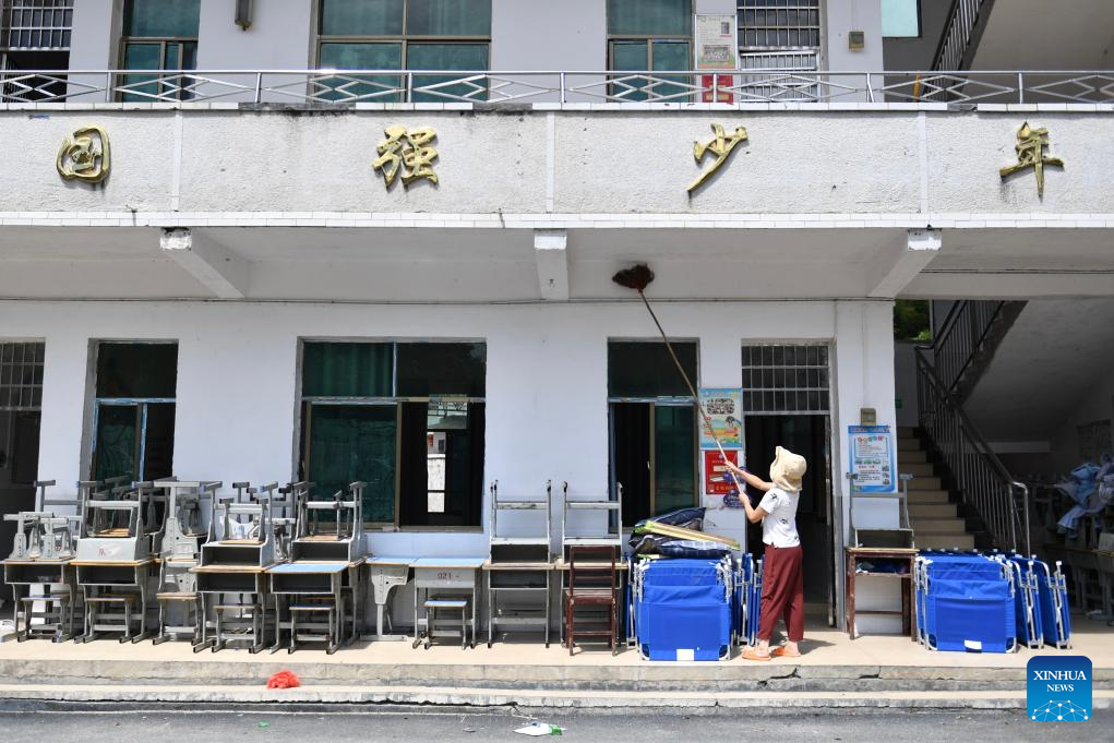 A staff member cleans up a teaching building at a middle school in Zixing City, central China's Hunan Province, Aug. 23, 2024. Local authorities are speeding up the reconstruction of the campus for the new semester after rainstorms unleashed by Typhoon Gaemi hit the city and damaged buildings and facilities in over 40 schools. (Xinhua/Chen Zhenhai)