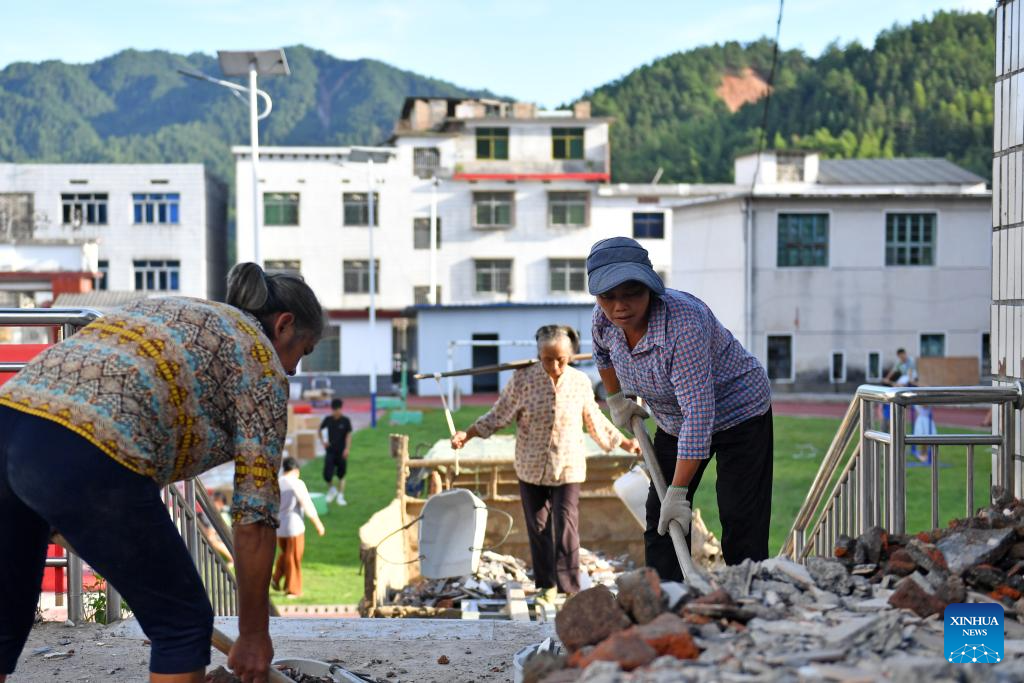 Workers clean up building rubble at a middle school in Zixing City, central China's Hunan Province, Aug. 22, 2024. Local authorities are speeding up the reconstruction of the campus for the new semester after rainstorms unleashed by Typhoon Gaemi hit the city and damaged buildings and facilities in over 40 schools. (Xinhua/Chen Zhenhai)
