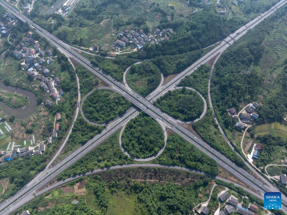 An aerial drone photo taken on Aug. 19, 2024 shows an interchange of Baotou-Maoming expressway and Shanghai-Chengdu expressway in Guang'an City, southwest China's Sichuan Province. Guang'an City, located in the eastern part of Sichuan Basin, is the hometown of Deng Xiaoping. With beautiful scenery and rich culture, Guang'an has taken advantages to boost the city's infrastructure construction and industrial development during the building process of the Chengdu-Chongqing economic circle. (Xinhua/Jiang Hongjing)