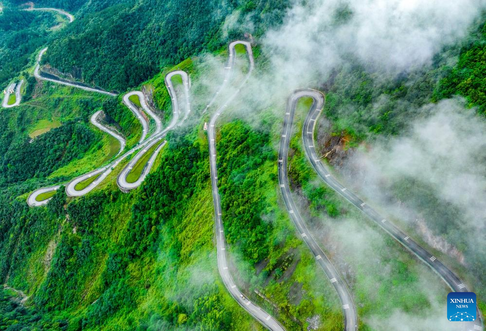 An aerial drone photo taken on Aug. 21, 2024 shows Hongyan highway at Huaying Mountain in Guang'an City, southwest China's Sichuan Province. Guang'an City, located in the eastern part of Sichuan Basin, is the hometown of Deng Xiaoping. With beautiful scenery and rich culture, Guang'an has taken advantages to boost the city's infrastructure construction and industrial development during the building process of the Chengdu-Chongqing economic circle. (Photo by Qiu Haiying/Xinhua)