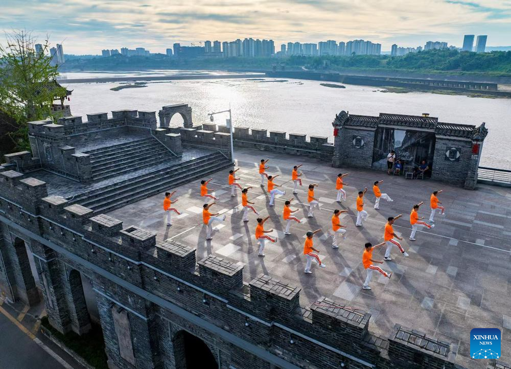 An aerial drone photo taken on Aug. 21, 2024 shows citizens doing morning exercises on the wall of the north gate of Binjiang Road in Guang'an District of Guang'an City, southwest China's Sichuan Province. Guang'an City, located in the eastern part of Sichuan Basin, is the hometown of Deng Xiaoping. With beautiful scenery and rich culture, Guang'an has taken advantages to boost the city's infrastructure construction and industrial development during the building process of the Chengdu-Chongqing economic circle. (Photo by Zhang Guosheng/Xinhua)