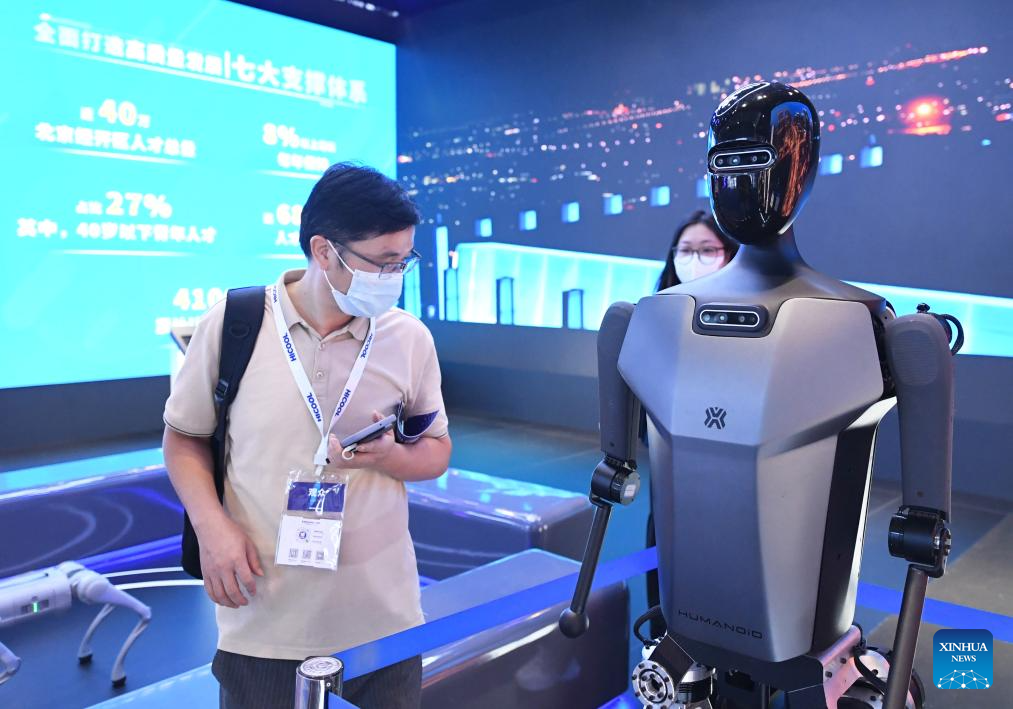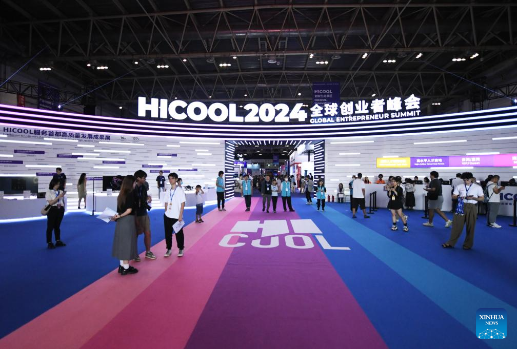 People visit the exhibition area of HICOOL 2024 Global Entrepreneur Summit in Beijing, capital of China, Aug. 24, 2024. The global entrepreneur summit was held in Beijing from Friday to Sunday. (Xinhua/Ren Chao)