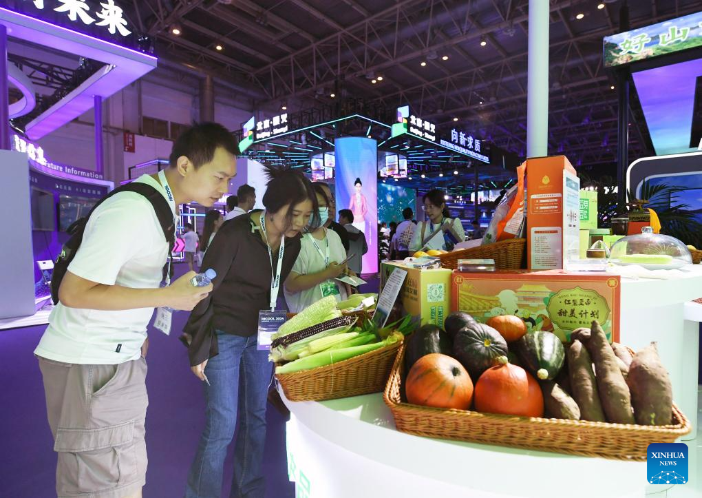 An exhibitor introduces agricultural products at the exhibition area of HICOOL 2024 Global Entrepreneur Summit in Beijing, capital of China, Aug. 23, 2024. The global entrepreneur summit was held in Beijing from Friday to Sunday. (Xinhua/Ren Chao)